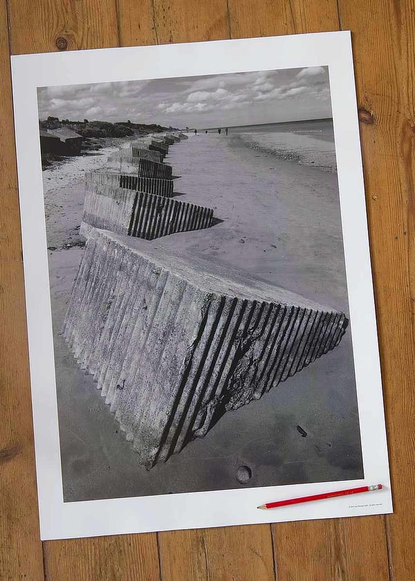 Discover the stark, compelling beauty of the coastline with this powerful monochrome photographic composition. The robust, geometric forms of the concrete sea defences, their ridged surfaces visibly etched by time and the relentless elements, create a striking visual rhythm against the vast, expansive beach. The subtle gradations of grey and the intricate play of light and shadow add profound depth and rich texture to the scene, while distant figures provide a crucial sense of human scale and presence. This artwork is a profound meditation on the dynamic interplay between man-made structures and the raw, natural environment, a moment captured where precise geometry and wild landscape powerfully converge, inviting contemplation on the enduring power and majesty of the sea.