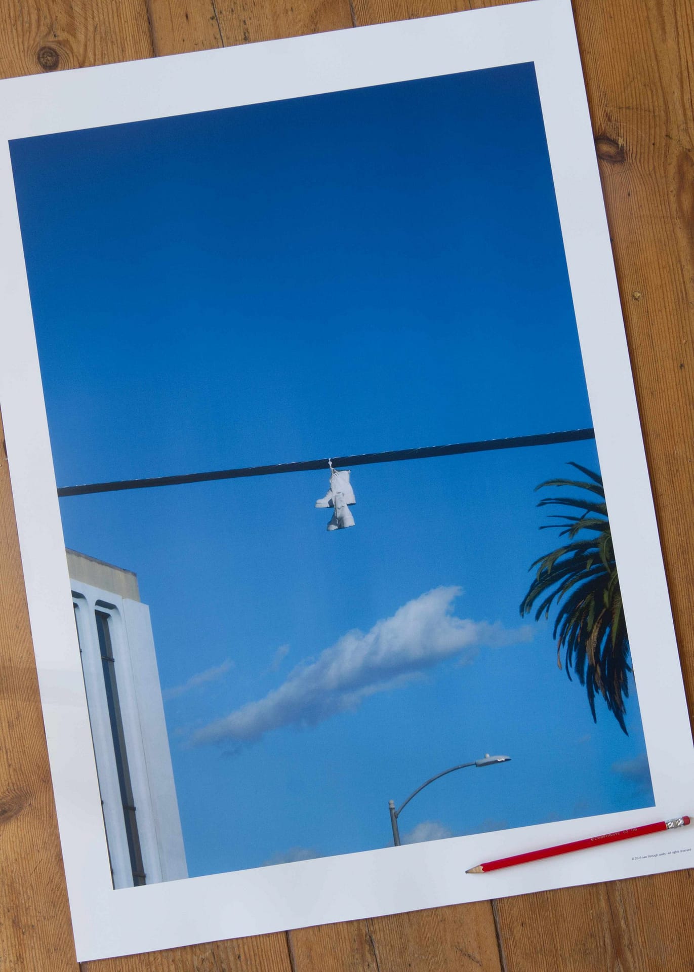 Encounter the delightfully unexpected under the expansive California sky with this striking photographic composition, where the ordinary is transformed into the wonderfully surreal. A pair of vibrant sneakers, suspended against an immense backdrop of brilliant blue, becomes the compelling focal point, their presence playfully defying expectation. The clean, architectural lines of a distant building and the graceful, iconic curve of a palm frond—a quintessential California element—add a touch of urban geometry, while a solitary cloud drifts serenely across the vast expanse. This artwork is a visual riddle, a moment of playful absurdity captured against a backdrop of simple, sun-drenched beauty, inviting the viewer to create their own unique narrative and discover charm in the unconventional, all bathed in the distinctive light of the Golden State.