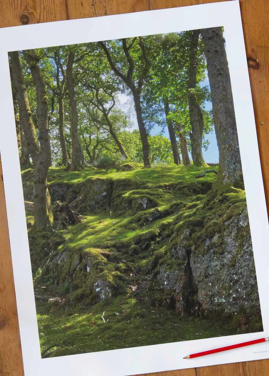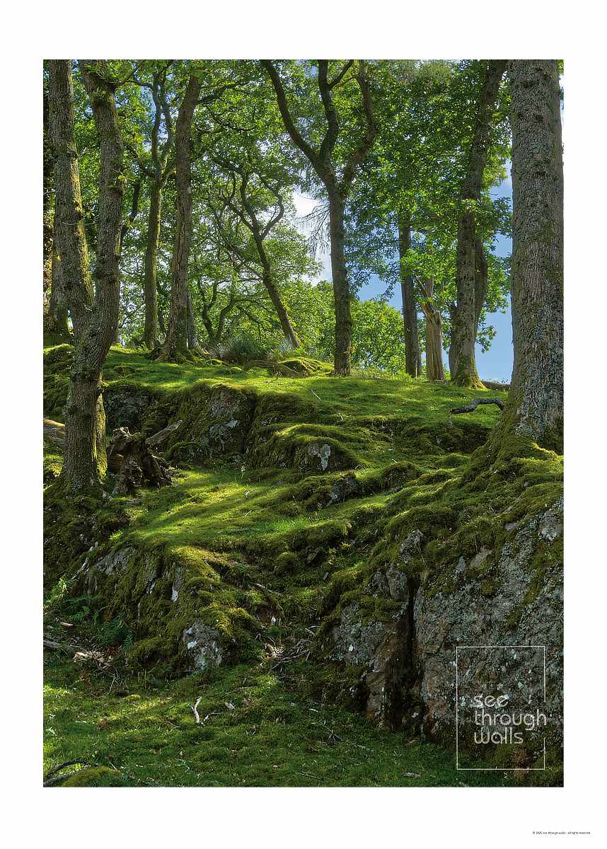 Poster Print – A tranquil forest with moss-covered ground, sunlit trees, and rocky terrain.