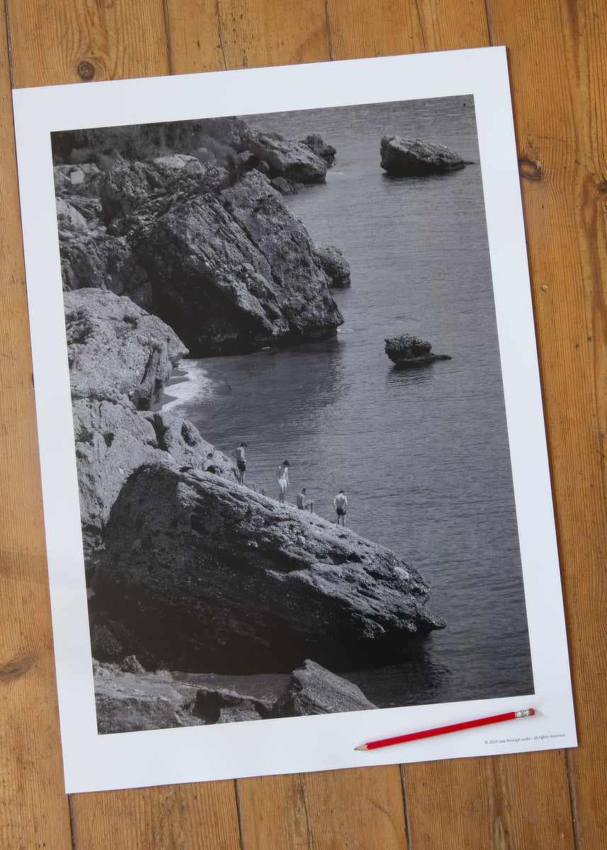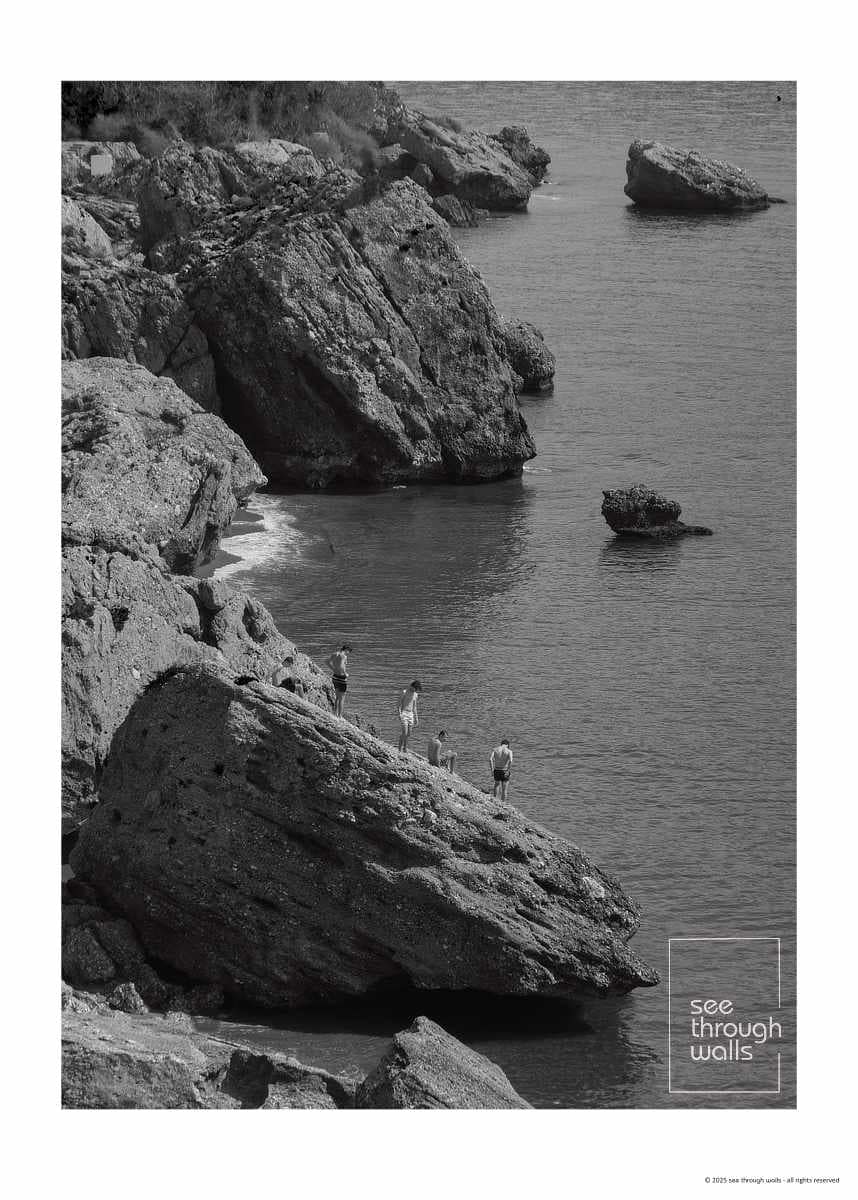 Immerse yourself in the profound serenity of the coast with this evocative monochrome photographic composition. The rugged, richly textured rocks, visibly etched with the relentless passage of time and tide, rise with stoic grandeur from the still, reflective surface of the sea. Tiny, distant figures stand silhouetted against the immense vastness of the landscape, adding a poignant human element to the scene and inviting deep contemplation on our intrinsic connection to the natural world. The masterful interplay of light and shadow, combined with the subtle gradations of grey, creates a powerful sense of depth and tranquil beauty. This artwork is a profound meditation on nature’s enduring power, a moment captured in the liminal space between solid land and boundless sea.