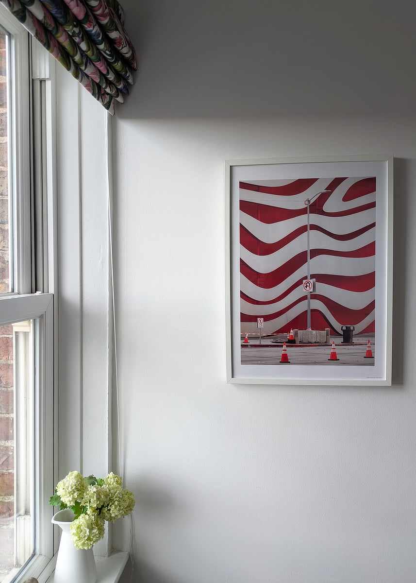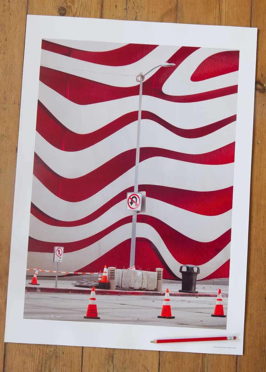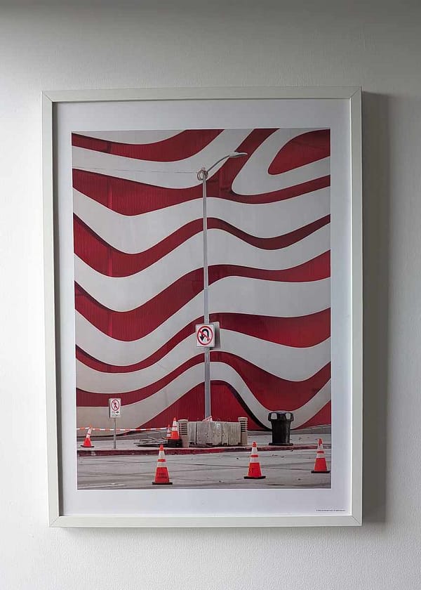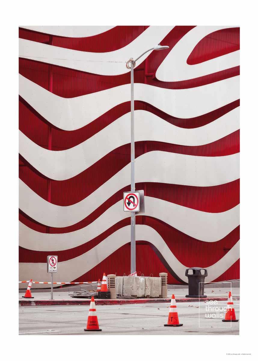 Experience the striking visual impact of cutting-edge contemporary architecture with this dynamic photographic composition, featuring the iconic facade of the Petersen Automotive Museum in Los Angeles. The undulating red and white ribbons of the building’s exterior create a mesmerising, fluid pattern, a bold testament to modern design’s transformative power within urban landscapes. The clean lines of the street furniture, the geometric precision of the traffic signs, and the vibrant orange of the safety cones all contribute to the image’s powerful graphic quality. This artwork is a celebration of architectural audacity, a moment captured where artistic vision and urban environment powerfully collide, inviting the viewer to appreciate the beauty of form and vibrant colour in the everyday landscape of Los Angeles.