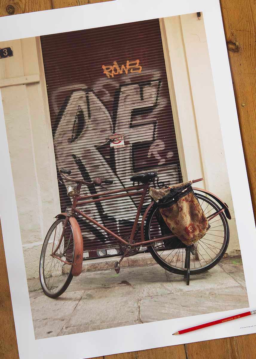 Photographic poster print – vintage bike leans against a graffiti-covered door, capturing an urban and artistic street vibe.