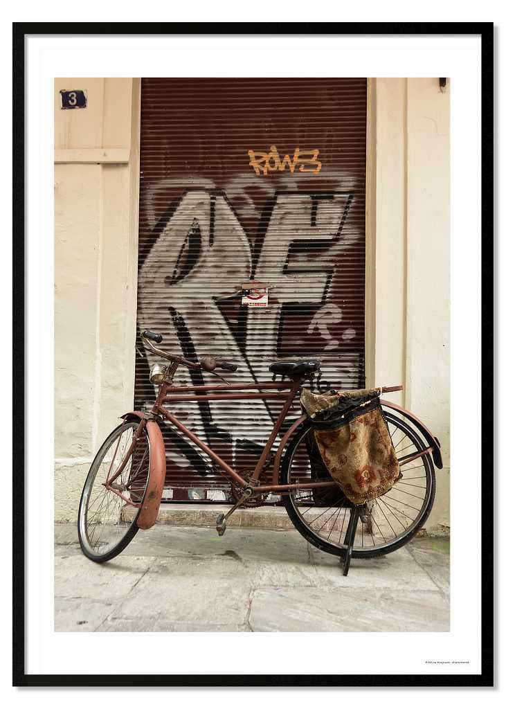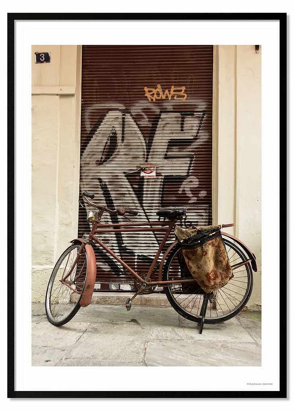 Discover an authentic slice of Athenian life with this charming photographic composition. A vintage bicycle, its frame worn with character and history, stands gracefully parked against a backdrop of a textured shutter, hinting at the city’s countless hidden corners. The eye is immediately drawn to the distinctive kilim pannier, its intricate patterns adding a touch of artisanal warmth and profound cultural richness to the scene. This exquisite detail speaks volumes about the city’s heritage of craftsmanship and the everyday beauty found within its vibrant streets. The muted tones and authentic textures evoke a powerful sense of place, capturing a fleeting moment in Athens’ unique urban tapestry. This artwork is a heartfelt celebration of everyday details, a captivating glimpse into the city’s very soul, where history and contemporary life beautifully intertwine.