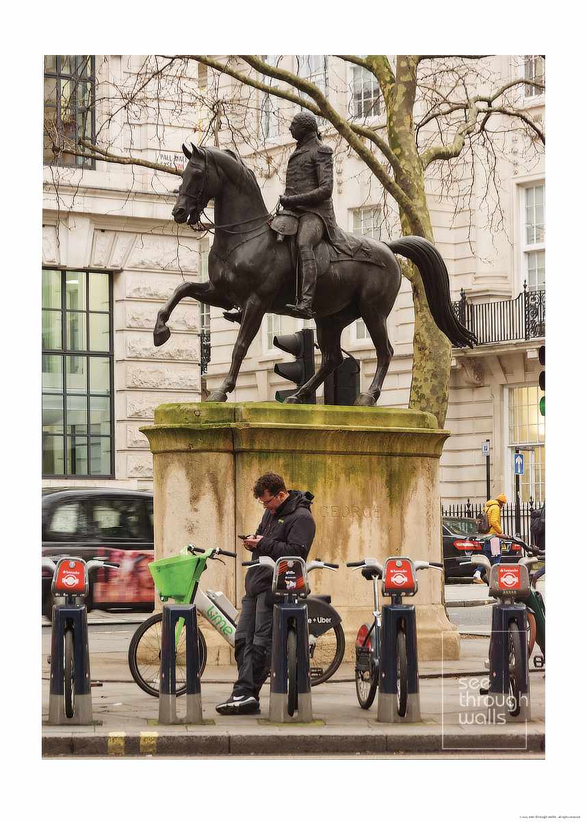 Observe a compelling dialogue between epochs in this evocative London composition. The majestic bronze equestrian statue of King George III stands resolute, a powerful emblem of historical grandeur, while beneath, the vibrant pulse of modern metropolitan life unfolds. A cyclist, momentarily absorbed in a digital world, and the fleeting blur of a passing taxi capture the city’s relentless motion. The stately, timeless architecture of the surrounding buildings forms a dignified backdrop, its solemnity softened by the delicate, bare branches of a winter tree. This fine art print is a captured moment, a visual narrative that prompts reflection on the ever-evolving story of urban existence.