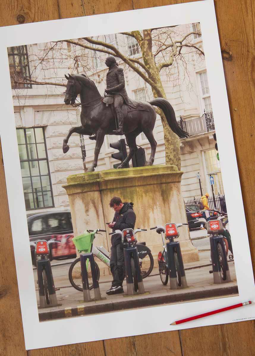 Photographic Poster Print – Statue and Bicycle Rental on a Busy London Street